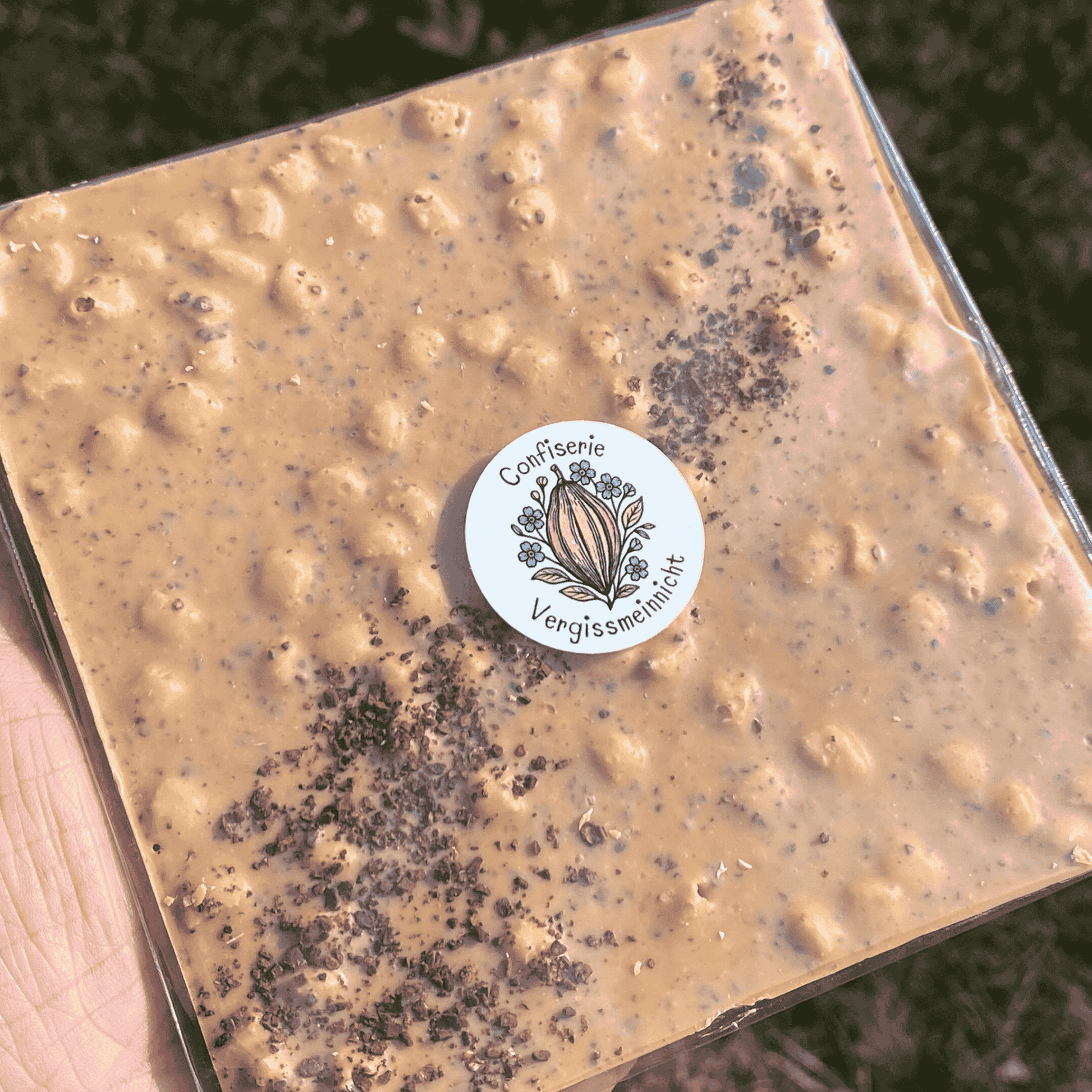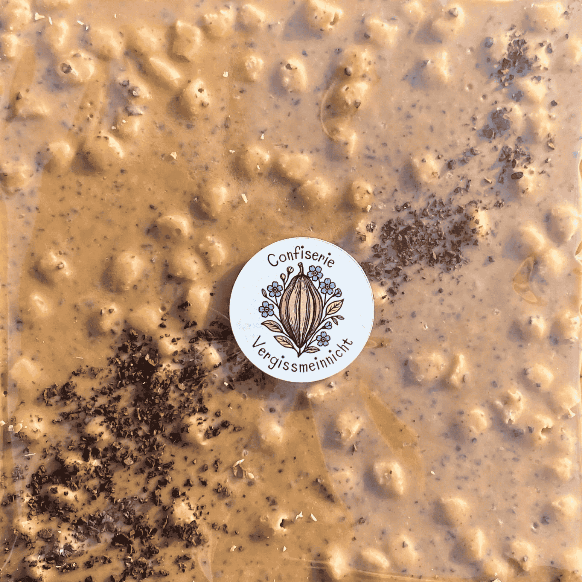 Die Tafel „Die Goldene" vereint die karamellige Süße blonder Dulcey-Schokolade von Valrhona mit der herben Tiefe von Espresso und dem knusprigen Biss gerösteter Haferpops. Röstaromen, Butterkaramell und eine feine Salznote: komplex, aber nie überladen.
